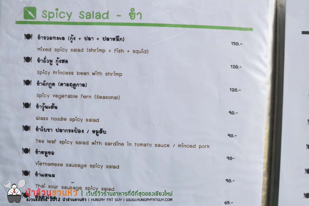 พูดตามตรงเลยนะครับ ตอนแรกที่น้าอ้วนเห็นการตกแต่งของรีสอร์ทนี้ น้าอ้วนแอบคิดในใจว่า “มันต้องแพงแน่ๆ หวะ” ตอนแรกก็สองจิต สองใจกับเพื่อนว่าจะเข้าไปดีหรือเปล่า กลัวกระเป๋าฉีก ๕๕๕ แต่เมื่อไหนๆ มาถึงแล้วก็ต้องลุยหละวะ ถ้าแพงจริงก็อาหารจานเดียวคนละจานก็พอ ๕๕๕ (ออกแนวชีวิตรันทดเสียจริง) เมื่อไปถึงครับ ปรากฎว่าโต๊ะไม่ว่างเลย เพราะคนเต็มตลอด ก็เลยจองไว้ก่อน แล้วก็ไปเดินเล่นถ่ายรูปบรรยากาศ พอถึงเวลาโต๊ะว่างพนักงานก็เรียกครับ พร้อมยื่นเมนู แว๊บแรกที่เปิดเมนู ราคาอาหารมันไม่ได้แพงอย่างที่คิดครับ อยู่ในระดับกลาง ที่พอจ่ายได้ ดังนั้นทุกคนเลยพร้อมเพรียงกันสั่งอาหารเลยทีเดียว