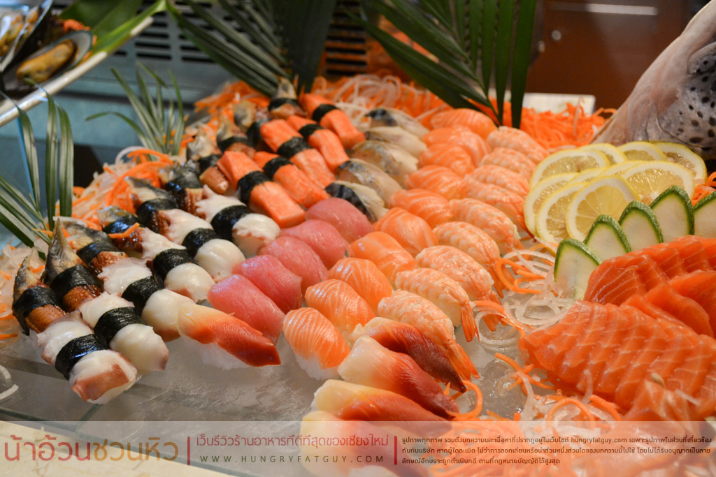 ไลน์อาหารญี่ปุ่น ที่นี่ก็จัดเต็มไม่แพ้กันครับ โซนปลาดิบมีทั้งแซลมอน ทูน่า ทาโกะ (ปลาหมึกยักษ์) ซาบะ หอยปีกนก ฯลฯ และในส่วนของซูชิ ก็จัดเต็มไม่แพ้กัน (โอ้ยยยย ตายๆๆๆ) ซูชิปลาไหลย่าง, ซูชิทาโกะ, ซูชิปูอัด, ซูชิแซลมอน, ซูชิกุ้งหวาน เป็นต้น
