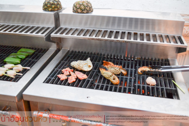 และในโซนด้านนอก Outdoor ก็จะมีไลน์บาร์บีคิวครับ ก็มีทั้งปลา ปลาแซลมอน เนื้อ ไก่ กุ้ง กั้ง ปู ฯลฯ ซึ่งเผาและย่างพร้อมเสิร์ฟให้ลูกค้าสามารถหยิบไปรับประทานได้ทันที