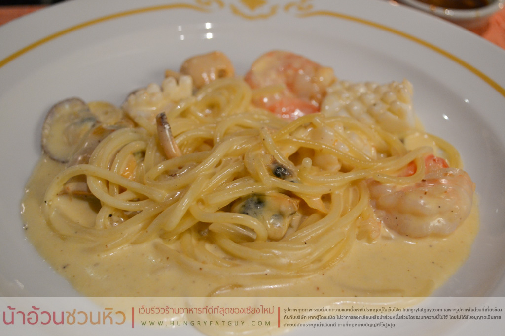 สปาเก็ตตี้น้าอ้วนขอเลือกเป็น สปาเก็ตตี้คาร์โบนาล่า รวมซีฟู๊ดนะครับ กุ้ง หอย ปู ปลา สดมาก น้ำซอสคาโบนาล่าก็ข้นสุดๆ แต่เชฟให้มาเยอะมากครับ เกือบทานไมหมดแหน่ะ