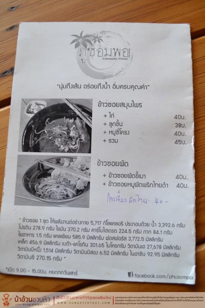 เมนูอาหารของที่นี่ก็ธรรมดาครับ แต่แอบเก๋ด้วยการบอกถึงข้อมูลทางโภชนาการของข้าวซอยด้วยนี่ Hahaha ได้ความรู้ดี นอกจากจะมีข้าวซอยแล้วก็ยังมีพวกอาหารจานเดียวไว้บริการด้วยราคาไม่แพง เฉลี่ยแล้วก็ 40 บาท และยังมีเมนูเครื่องดื่มด้วย ได้ข่าวว่าที่นี่เขามีเมล็ดกาแฟ ที่เป็นแบรนด์ของตัวเองด้วย