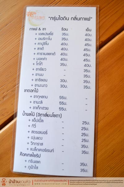อย่างที่เกริ่นไว้ว่าที่นี่นอกจากอาหารแล้วเขายังมีเครื่องดื่มพวกกาแฟ ที่เขาเป็นเจ้าของแบรนด์เมล็ดกาแฟอีกด้วย แบรนด์นั่นก็คือ Phu Som Por ซึ่งก็ได้ทำส่งให้กับร้านกาแฟหลายๆ ร้านทั่วเชียงใหม่ครับ สำหรับกาแฟที่ทีมงานน้าอ้วนได้ดื่มกันในวันนี้มี 2 ตัวคือ Cappuccino และ Latte ขอกล่าวโดยรวมแล้วกันว่าทั้งสองแก้วนั้นรสชาติอร่อยเลยครับ ลาเต้ก็กลมกล่อมด้วยรสชาตินม และส่วนคาปูชิโน่ ก็จะเป็นกาแฟเน้นทางความเข้มเป็นหลัก