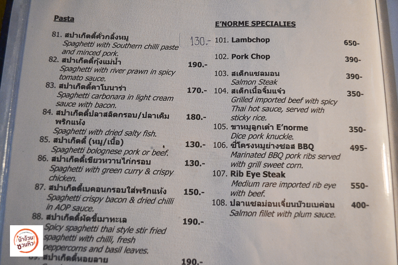 มีอยู่ช่วงหนึ่งที่เจ้าของร้านเล่าให้ฟังว่า ตอนที่เปิดร้านใหม่ๆ ก็เชิญพี่ๆ สื่อมวลชนมาร่วมงานเปิดร้าน และทุกสื่อก็ลงข่าวประโคมข่าวไปว่าร้านแห่งนี้หรูหรา อลังการ สวยงาม พอเจ้าของร้านได้อ่านแล้วก็รู้สึกเครียดและวิตก เพราะว่าเมื่อทุกคนเห็นภาพว่าที่นี่หรูหรา อลังการแบบนี้ ก็คงไม่กล้าที่จะเข้ามา เพราะกลัวว่าจะแพง แต่ถ้าหากเราดูราคาของอาหารในเมนูแล้ว น้าอ้วนเชื่อว่าผู้ชมหลายท่านคงรู้ว่าราคาระดับนี้ไม่ได้แพงเลย เมื่อเทียบกับบรรยากาศของร้าน และลองดูภาพอาหารแต่ละอย่างสิ เขาทำออกมาได้ดีเลยนะ และรสชาตินี่น้าอ้วนการันตีได้เลยว่าไม่แพ้ร้านดังๆ ในเชียงใหม่เลย หากใครที่อยากสัมผัสความหรูหราสักครั้ง ก็เชิญที่ The E’norme ได้เลยครับ แต่ไม่ต้องพกตังมาเยอะก็ได้นะ เพราะมาทานที่นี่เบาๆ ก็จ่ายเบาๆ