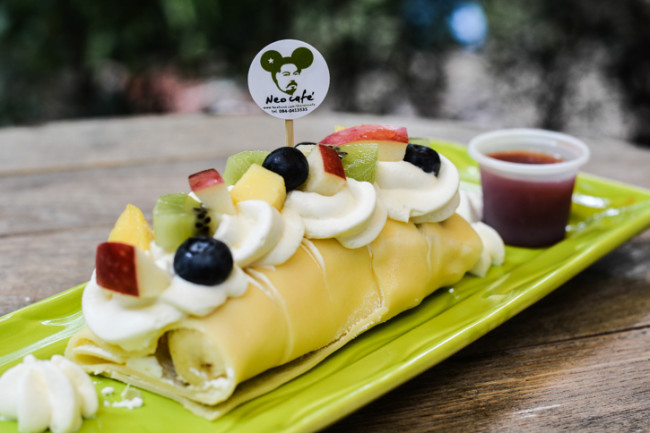 เครปกล้วยหอม หรือ Neo Banana Crepe ด้านนอกจะเป็นแป้งเครปที่นุ่มและเนียนห่อกล้วยหอมทั้งลูกไว้ด้านในพร้อมกับวิปปิ้งครีม ด้านบนก็จะมีวิปปิ้งครีมและผลไม้หลากหลายชนิดท๊อปปิ้งด้านบน และที่ขาดไม่ได้คือซอสสตรอเบอรี่ที่จะมาเพิ่มความอร่อยให้เครปกล้วยหอมชิ้นนี้ครับ รสชาติสำหรับแป้งเครปจะนุ่มดีเมื่อได้ทานกล้วยหอมเข้าไปด้วยแล้วก็ถือว่ารสชาติมันเข้ากันได้ดีนะ ตามด้วยผลไม้ที่เสิร์ฟมาด้วย จะรู้สึกชุ่มฉ่ำและสดชื่นทีเดียว