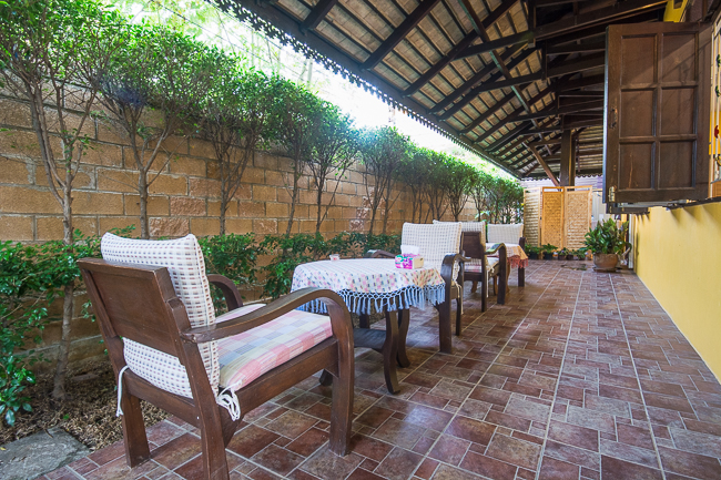 ชื่อบ้านหลังนี้ชื่อว่า เฮือนล้านนา เป็นบ้านสไตล์ล้านนาประยุกต์ ด้านล่างก็มีส่วนโต๊ะบริการ แต่ถ้าใครที่มาเป็นหมู่คณะ และอยากใช้บริการห้องแอร์ ก็ขึ้นไปชั้นบนได้ โต๊ะและเก้าอี้นั่งสบายกว่า