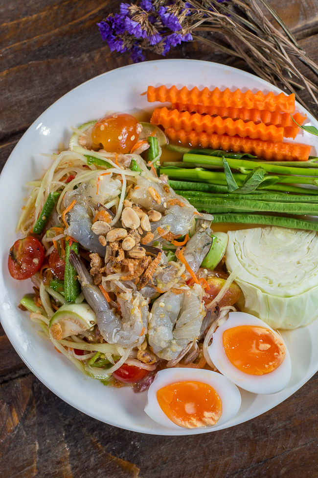 ตำไข่มะตูมกุ้งสด (79 บาท) สาวกส้มตำรับรองว่าถ้าเจอเมนูนี้ต้องปลื้มแน่นอน พูดในเรื่องของปริมาณก็เสิร์ฟกันมาแบบจานใหญ่ๆ พูดถึงกุ้งก็ไม่น้อยหน้ากุ้งตัวใหญ่ๆ ใส่กันมาแบบหลายตัวมาก พร้อมทั้งไข่ยางมะตูมเยิ้มๆ และส้มตำรสชาติจัดจ้าน แซ่บเว่อร์ ทำให้เมนูนี้ปริมาณ รสชาติ กับราคาสวนทางกันจริงๆ