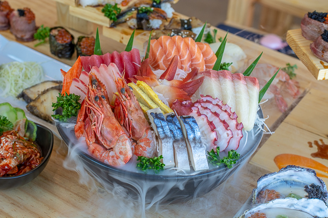 ในหมวดของปลาดิบ (Sashimi) นั้น จัดเต็มกันด้วย แซลมอน, อิซูมิได, ไข่หวาน, ซาบะดอง, ปูอัด, ทูน่า, กุ้งหวาน, ทาโกะ, หอยปีกนก และฮามาจิ