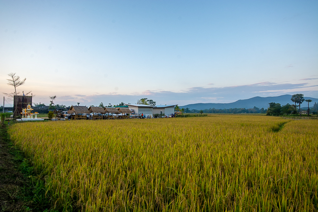 เมื่อมาถึงร้าน สิ่งที่น้าอ้วนได้อธิบายไว้ตั้งแต่ข้างต้นทุกคนก็จะได้สัมผัสเอง ร้านอาหารเล็กๆ ที่หันหน้าไปยังทุ่งนาที่ตอนนี้ทุ่งข้าวออกรวงเหลืองสวยงาม ห้อมล้อมไปด้วยแนวเขาต่าง ๆ ตลอด 360 องศา พร้อมทั้งมีสระน้ำและทางเดินเที่ยวชมบรรยากาศสวนของทางร้านรูปทรงเลข 8 อีกทั้งทางร้านก็ยังมีโซนที่เอาไว้ตั้งเต้นท์ให้บริการ สำหรับใครที่อยากมาพักค้างคืนช่วงฤดูหนาวแบบนี้ รับรองเลยว่าฟินแน่นอน