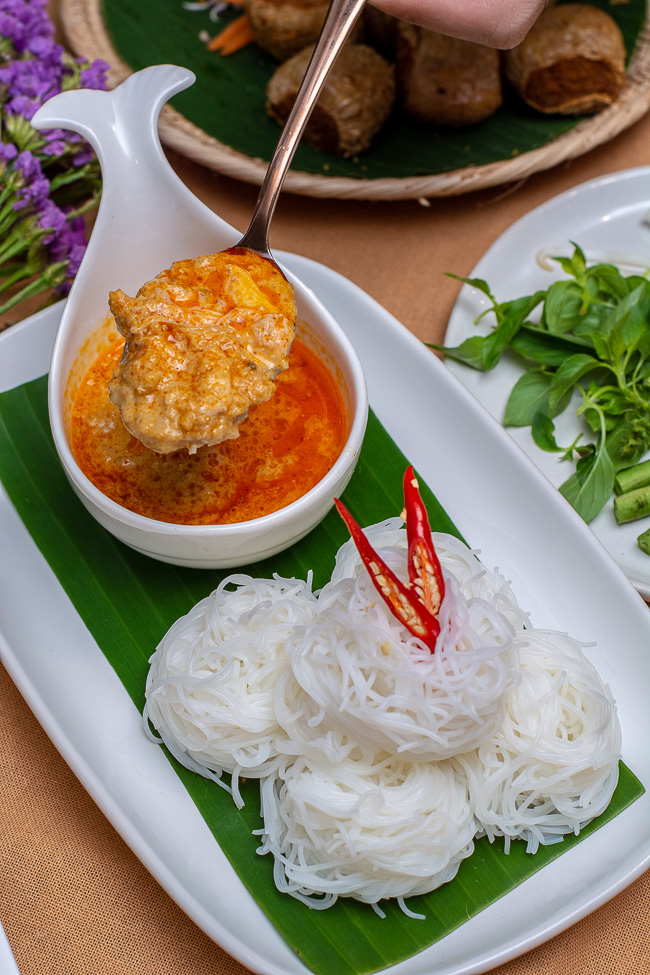 ขนมจีนน้ำยาปูและผักสด (129 บาท) ความเข้มข้นของน้ำยากะทิที่ทั้งหอมและมัน หวานและเผ็ดผสมกันได้อย่างลงตัว พร้อมทั้งเนื้อปูที่ข้นมาก ตักมาเมื่อไรก็ได้เนื้อปูติดมาเต็มช้อน เมนูขนมจีนอร่อย ๆ กับเนื้อปูแน่น ๆ แบบนี้ไม่ควรพลาด