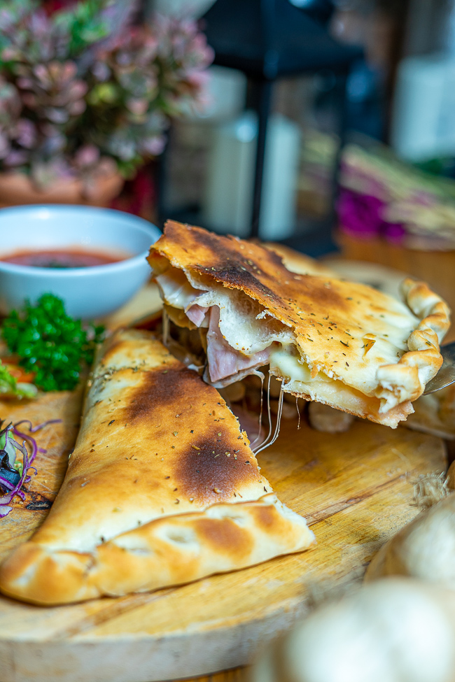 Calzone Pizza (345 บาท) หรือบางคนอาจจะเรียกว่าพิซซ่าพับ เพราะหน้าตาของมันจะเป็นลักษณะคล้ายเอาพิซซ่ามาพับแบบครึ่งวงกลม ด้วยสายตาแล้วพิซซ่าถาดนี้ขนาดใหญ่มาก แล้วเอามาพับครึ่ง ด้านในมีทั้งชีส แฮม และก็เห็ดอัดแน่นจนเต็มชิ้น ใครชอบความเป็นชีส และพิซซ่าที่อุ่นอยู่ตลอดเวลา เมนูนี้แหละรับประกันความอร่อย