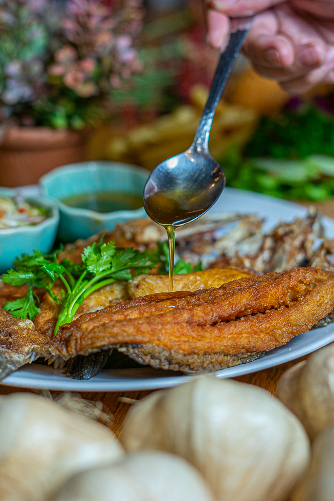ปลากะพงทอดน้ำปลา (395 บาท) ปลากะพงตัวใหญ่ ๆ แล่กลางให้เป็นสองซีก เอาไปทอดในน้ำมันร้อน ๆ ท่วมตัวปลาจนได้ปลากะพงทอดที่กรอบนอกนุ่มใน เสิร์ฟพร้อมกับน้ำปลากวนรสชาติหวาน ๆ เค็ม ๆ และน้ำยำมะม่วงที่มีรสชาติเปรี้ยวนำ เพื่อเพิ่มรสชาติให้สมบูรณ์แบบยิ่งขึ้น