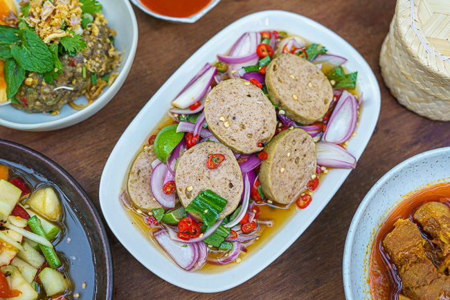 คุยไปซะยาวเหยียด คงเริ่มหิวกันแล้วหละสิ … มาร้านอาหารเหนือ ก็เริ่มกันด้วยเมนูสุดฮิต Appetizer ตามแบบเมืองเหนืออย่าง ออเดิร์ฟเมือง (199 บาท) ชุดตะกร้าเล็ก ๆ ที่เสิร์ฟเมนูกินเล่นเรียกน้ำย่อยในแบบของเชียงใหม่ ไม่ว่าจะเป็นไส้อั่ว แคบหมู แหนมหม้อ หมูยอ ไข่ต้ม ผักลวก และน้ำพริก 2 สไตล์อย่างน้ำพริกหนุ่มและน้ำพริกอ่อง