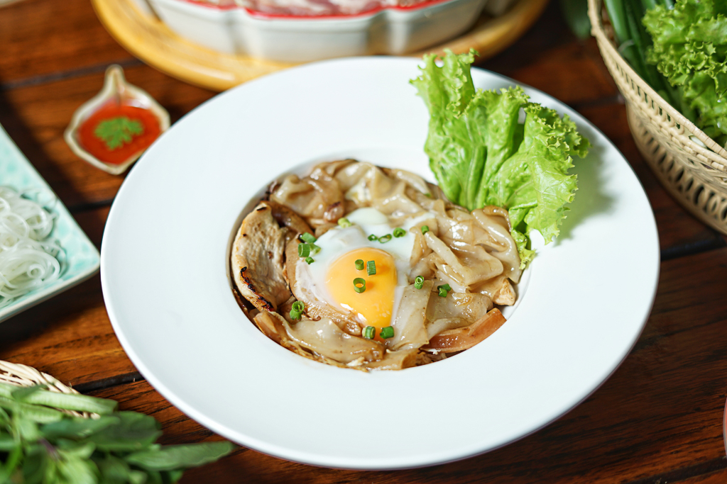 สำหรับอาหารนั้น ที่นี่จะเน้นอาหารไทยเป็นหลัก สำหรับเมนูแรกบอกเลยว่าน้าอ้วนแอบสังเกตว่าทุกโต๊ะจะต้องมีเตาแก๊สเล็ก ๆ สแตนบายไว้ แสดงว่าเมนูนี้สุดฮิต นั่นก็คือ ชาบู 2 น้ำ (ต้มยำและหมูตุ๋น) ชุดละ 189 บาท ถ้าจะเรียกว่าชาบูอาจจะไม่ถูกนัก เพราะเซ็ทนี้เขาจะมีเครื่องเคียงที่เหมือนจะให้เราทำก๋วยเตี๋ยวมาให้พร้อมสรรพ ไม่ว่าจะเป็นเส้นทั้ง เส้นเล็ก เส้นใหญ่ หมี่เหลือง หรือหมี่หยก และเครื่องเคียงต่าง ๆ ทั้งหมูบด, ลูกชิ้น, สันคอหมู, หมูกรอบ ไข่ต้ม หอมเจียว แคบหมู และผักต่าง ๆ ทั้งน้ำซุปที่เป็นทั้งน้ำต้มยำเองและหมูตุ๋นซึ่งมีหมูตุ๋นจริง ๆ อยู่ในน้ำซุปด้วย เรียกได้ว่าเราสามารถ DIY ก๋วยเตี๋ยวในสูตรของเราเอง หรือจะกินเป็นชาบูสไตล์ญี่ปุ่นอีกแบบหนึ่งก็ได้นะ