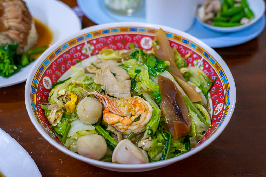 สุกี้แห้งทะเล (50/60 บาท) สุกี้จานนี้คือสิ่งที่น้าอ้วนชอบมาก เพราะเป็นสุกี้ที่ผัดผักจนไม่เปื่อยยุ่ย ทางร้านจะผัดเพียงให้ผักสลดเท่านั้น ยังคงความกรอบและหวานของผัก เสริมความอร่อยด้วยอาหารทะเลไม่ว่าจะเป็นกุ้ง ลูกชิ้นปลา เกี๊ยวปลา หมึก หมึกกรอบ และน้ำจิ้มสุกี้สูตรเด็ดของทางร้าน ใครชอบสุกี้ที่มีความสดและกรอบ ต้องร้านนี้แหละ