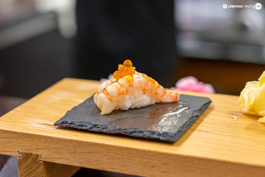 หลังจากนั้นก็เข้าสู่เมนู Nigiri ก็คือข้าวปั้นนั่นเอง ปลาและวัตถุดิบชั้นยอดหลากหลายชนิด ซึ่งต้องบอกว่าเป็นแบบพรีเมียมแท้ ๆ สั่งตรงจากญี่ปุ่นและทั่วโลก มาแล่กันสด ๆ ปั้นกันสด ๆ พร้อมเสิร์ฟถึงมือ ไม่ว่าจะเป็น ปลามาได, ปลาคินเมได, ปลาคัมปาจิ, กุ้งอามะเอบิ, หอยเชลล์ฮอกไกโด และตับห่านฝรั่งเศส เป็นต้น