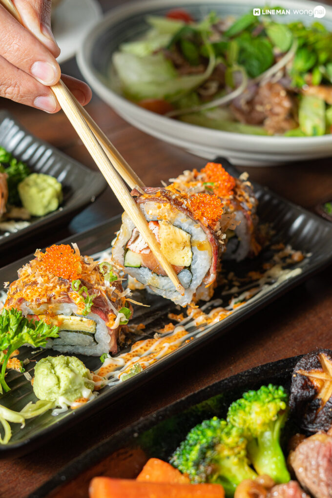 เนื้อวากิวโรล พิเศษสำหรับใครที่ชอบกินเนื้อ โรลไส้แน่นทั้ง ไข่หวาน ปูอัด แซลมอน แตงกวา ม้วนกับสาหร่ายแน่นกำลังดี ด้านบนท็อปด้วยเนื้อวากิวสไลซ์ เบิร์นไฟให้สุก ราดด้วยซอสเมนไต เพิ่มความว้าวด้วยไข่กุ้งด้านบนอีกที