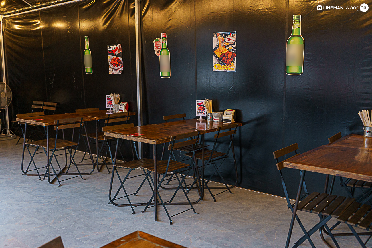 บรรยากาศร้านเกาหลีร้านอื่นอาจจะเป็นเต๊นท์แดง แต่ที่นี่เป็นเต๊นท์ดำ ด้านในมีโต๊ะให้บริการที่ไม่แออัด แต่แอร์เย็นสบายดีมาก