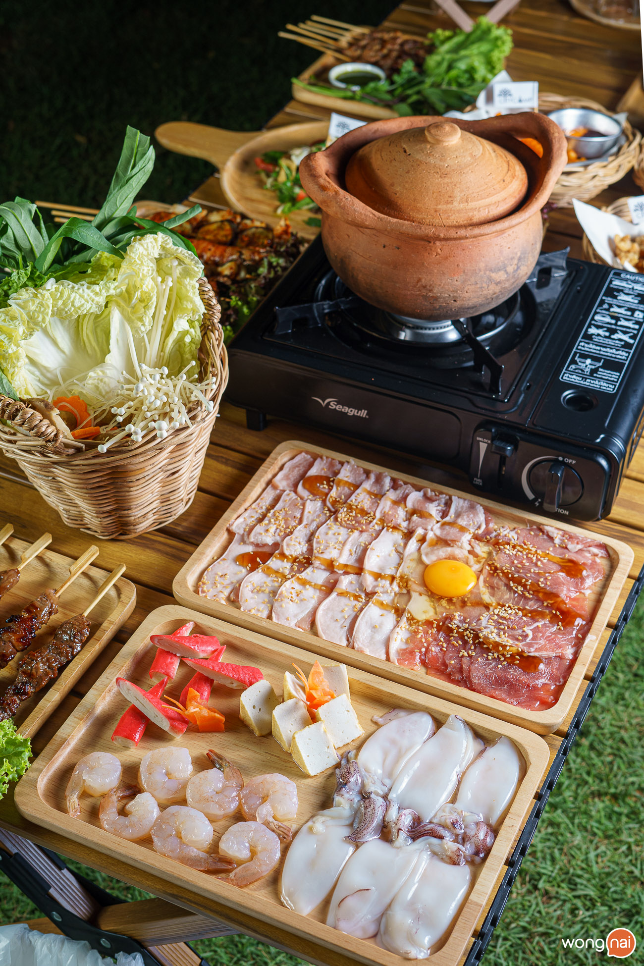 ปกติเวลาที่เราไปแคมป์ เรามักจะจัดเมนูอะไรไปบ้าง? แน่นอนว่ามันต้องหมูจุ่ม หรือหมูกระทะไปแน่นอน ดังนั้นเรามาฟินกับ เซตหมูจุ่ม พร้อมผัก (199 บาท) จัดมาพร้อมสรรพ ถึงเวลาก็หย่อนน้อง ๆ ลงหม้อ ต้มให้สุกกินกับน้ำจิ้ม และเครื่องดื่มเย็น ๆ ฟินเลย