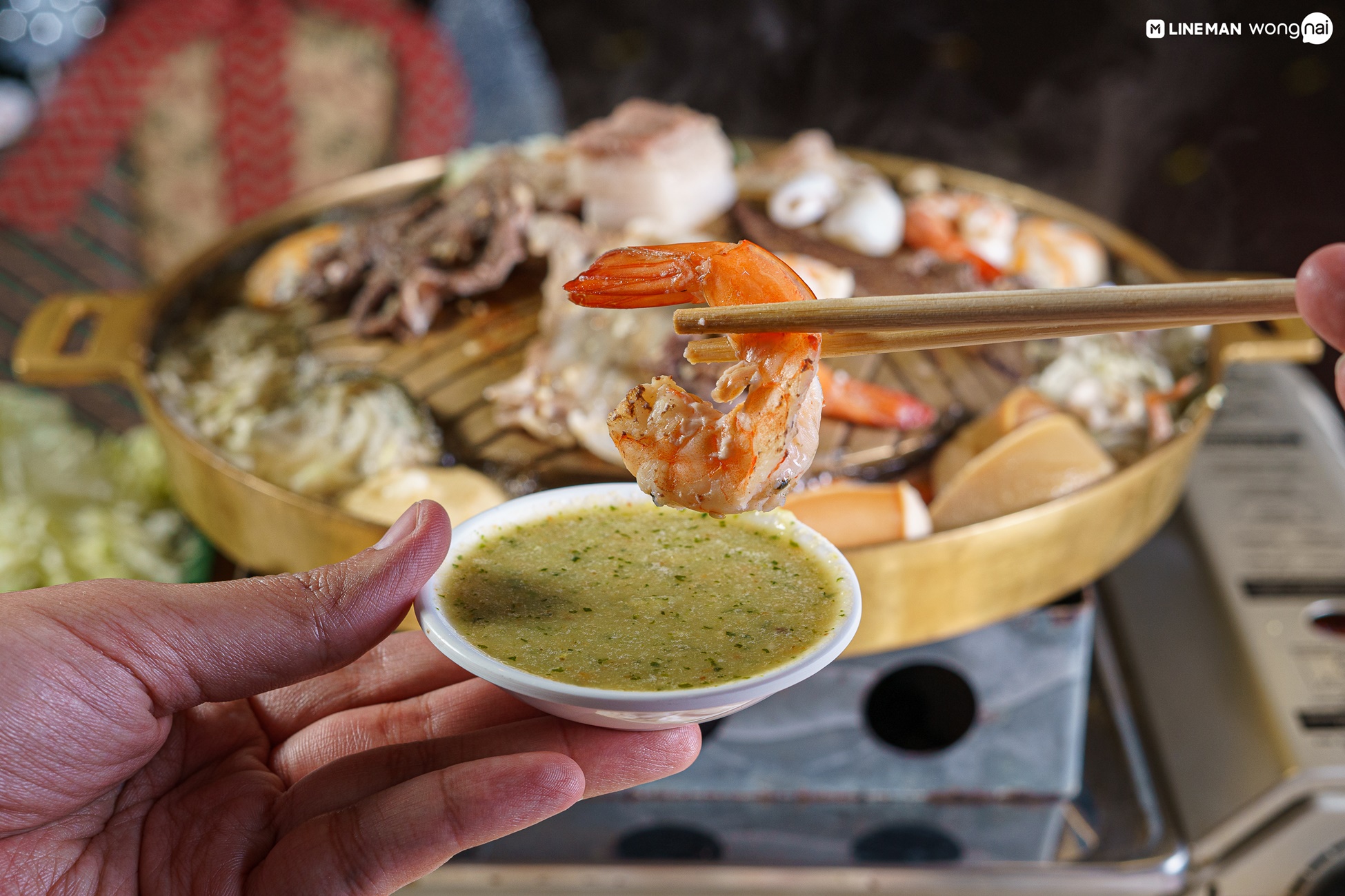 เมื่อทุกอย่างมาพร้อมแล้ว จะรอทำไมอีก บรรจงเรียงลงเตาหมูกระทะได้เลย ที่นี่เขาจะใช้เตาหมูกระทะแบบทองเหลือง ซึ่งจะร้อนเร็วและร้อนนาน อีกทั้งทางร้านยังใส่ใจ มีที่บังเปลวไฟด้วย เคยเป็นไหม? ช่วงแรก ๆ คนกินมักจะใจร้อน ก็จะเร่งแก๊สใหัมันแรง และบางทีแก๊สก็จะลวกมือได้ ดังนั้นทางร้านเลยมีที่บังเปลวไฟให้นั่นเอง