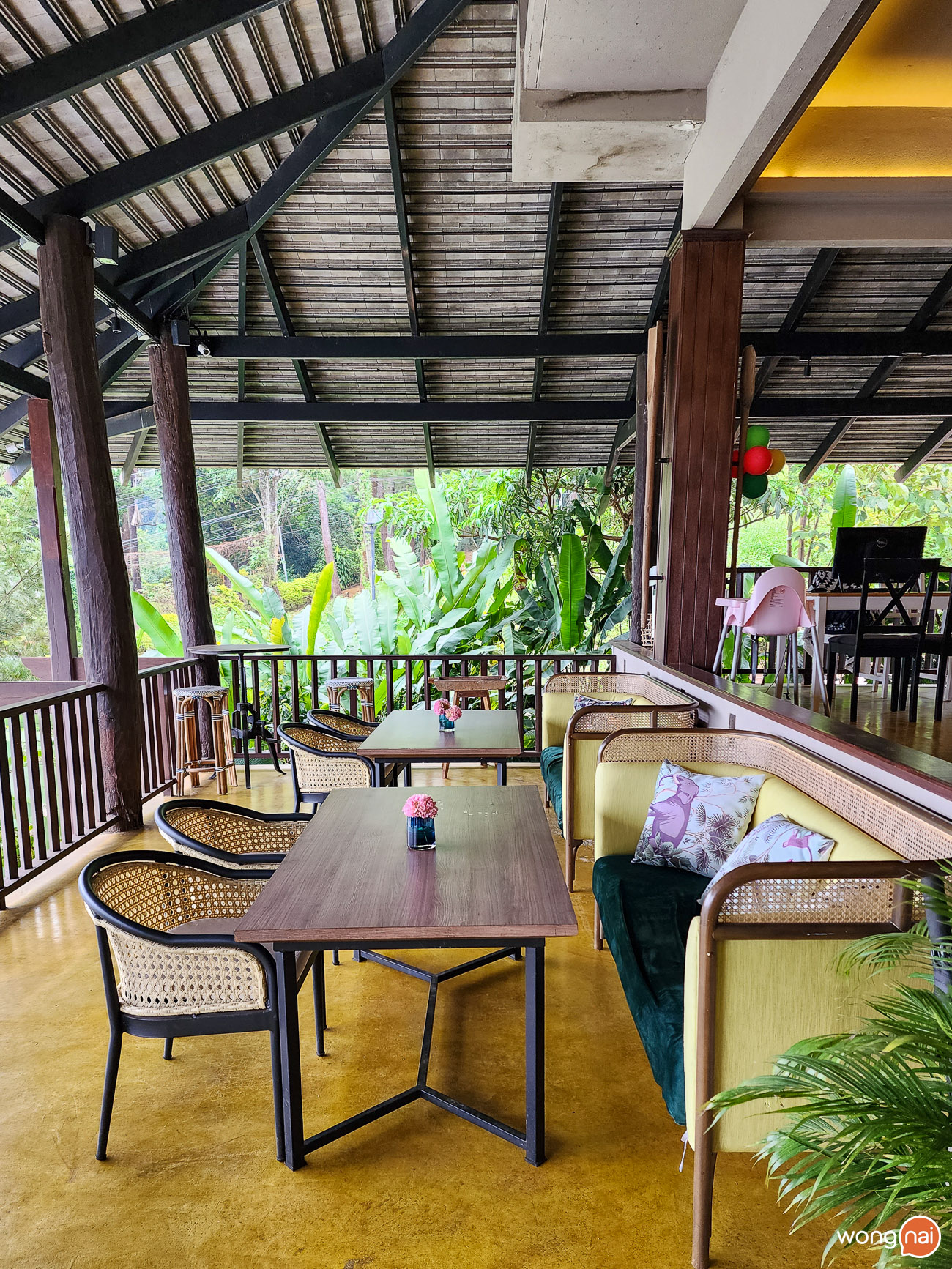 ร้านนี้จะมีลักษณะเป็นแนวกว้าง หันหน้าไปทางเวิ้งของภูเขา ทำให้สามารถมองเห็นวิวที่อยู่ด้านล่างได้อย่างชัดเจนจากบริเวณด้านในร้าน ส่วนใครที่อยากสัมผัสความเป็นกลางแจ้ง ดาดฟ้าของร้านก็จะสามารถมองเห็นวิวของอำเภอแม่ริมได้อย่าง 360 องศาด้วยเช่นกัน