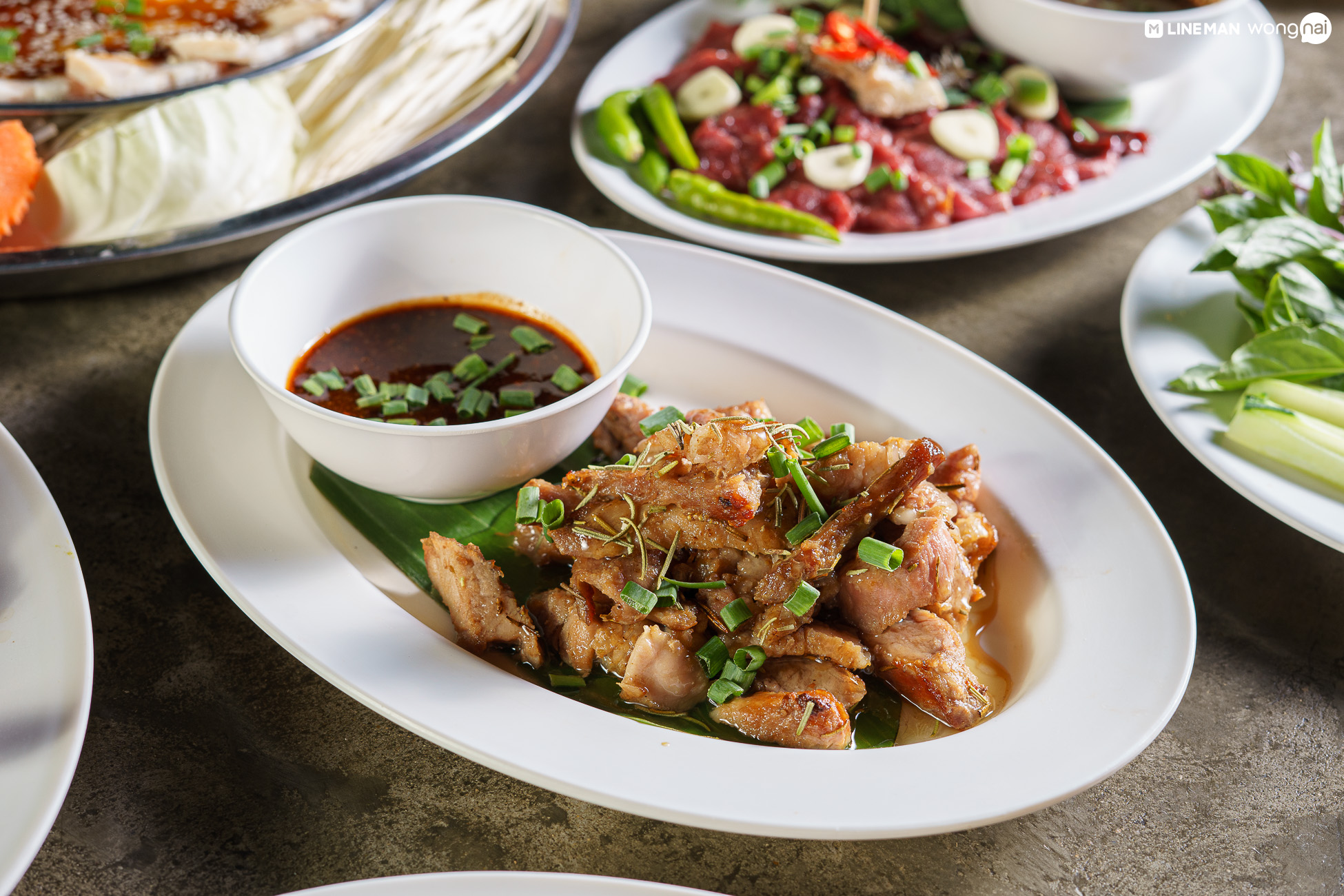 พระเอกเมนูแรกก็คงหนีไม่พ้น แจ่วฮ้อนหมู (199 บาท) ครบเครื่องเรื่องหมูทั้งสามชั้น หมูหมัก หมูบด ตับ และผักที่เรียกได้ว่าเสิร์ฟกันมาทั้งถาด จุดเด่นก็คงหนีไม่พ้นเรื่องของน้ำแจ่วฮ้อน รสชาตินัว เข้มข้น